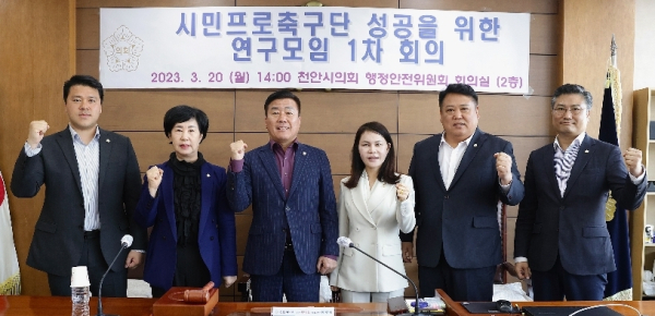 [충청뉴스 박동혁 기자] 충남 천안시의회는 ‘시민프로축구단 성공을 위한 연구모임’이 지난 20일 행정안전위원회 회의실에서 1차 회의를 열었다고 밝혔다.