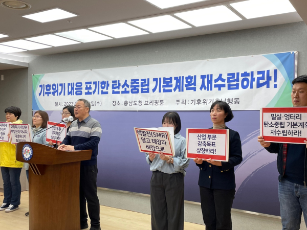마지막으로 “미래 세대에 책임을 전가한 윤 정부의 탄소중립 기본계획을 충남의 시민사회는 인정할수 없다”며 “윤 정부는 탄소중립 기본계획을 전면 재수립하라”고 규탄했다.