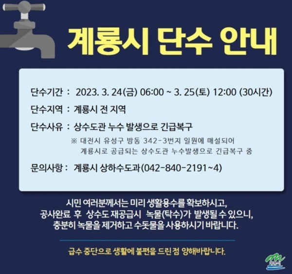 이에 따라 계룡시는 부랴부랴 지역 내 SNS를 이용해 3월 24일 오전 6시부터 25일 12시까지 30시간 단수 안내를 예고했다.