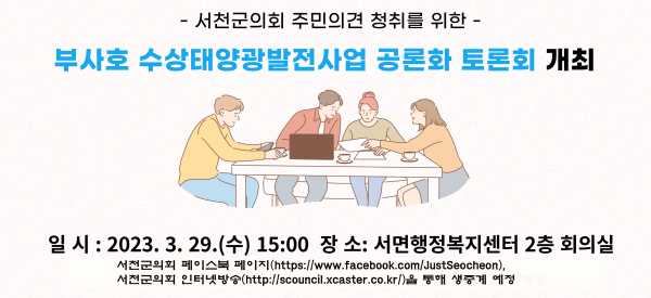 오는 29일 3시 서면행정복지센터 2층 회의실 열리는 이번 토론회는 주민 누구나 방청할 수 있고 서천군의회 페이스북 페이지(https://www.facebook.com/JustSeocheon)와 서천군의회 인터넷방송(http://scouncil.xcaster.co.kr/)을 통해 생중계 될 예정이다.