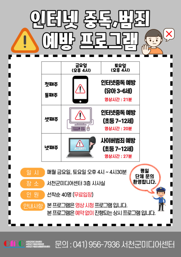 [충청뉴스 서천 = 조홍기 기자] 서천군미디어문화센터(센터장 김세용)는 오는 4월부터 어린이를 위한 특별 프로그램 <인터넷 중독·사이버 범죄 예방>을 운영한다고 밝혔다.