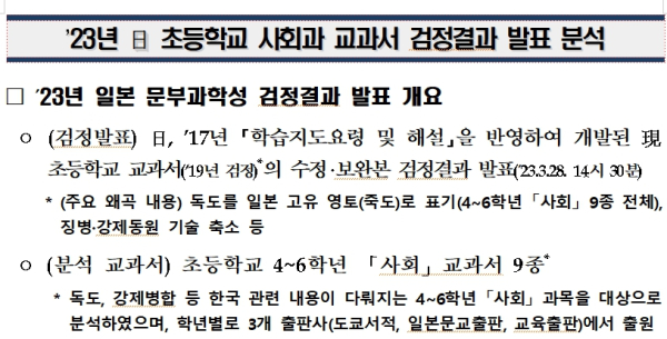 * 이번 검정본은 2019년 검정 통과한 초등학교 4~6학년 사회과 교과서(학년별 3종, 총 9종)와 동일하게 ‘독도는 일본 고유의 영토, 한국이 불법 점거, 일본이 한국에 항의하고 있음’으로 기술