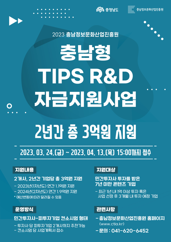 [충청뉴스 박동혁 기자] 충남정보문화산업진흥원(이하 진흥원)은 충남도와 2023년 민간투자연계형 충남 TIPS R&D 자금지원사업에 참여할 민간투자사(7년 미만)의 피투자 콘텐츠 기업을 모집하고 있다고 28일 밝혔다.