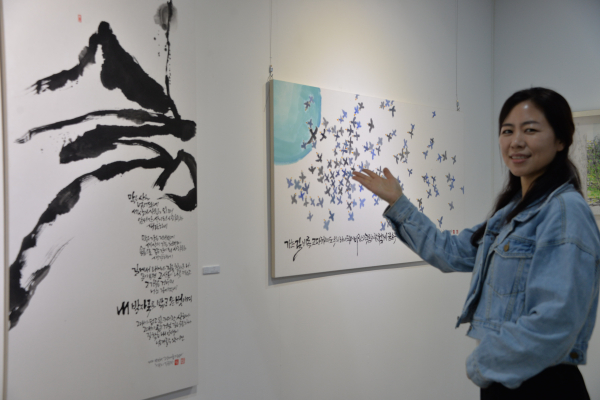 전시실을 찾은 이순열 세종시의회 산업건설위원장은 김순자 캘리작가로 부터 전시작품 설명과 예술인들의 애로사항 등을 청취했다.