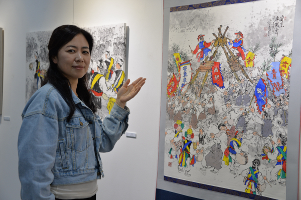 조희성 회장의 ‘神明 한마당’은 우리 민족이 힘든 노동의 고통을 신명으로 승화하여 꽹과리, 장구, 북, 징으로 함께 어우러지는 흥겨운 표정을 수묵으로 그린 작품이다.