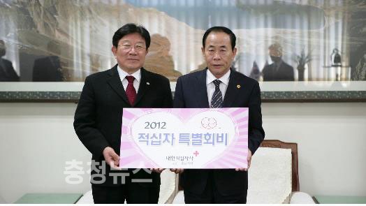 충남도의회 유병기 의장(오른쪽)은 16일 의장 접견실에서 대한적십자사 대전·충남지사 민경용 회장에게 2012년 특별회비를 전달하고 있다.