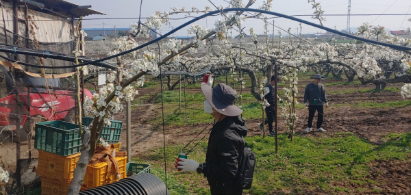 이번 봉사활동은 지원청 직원 30여 명이 자발적으로 참여해 배 농가의 배꽃 인공수분 작업에 힘을 보탰다.