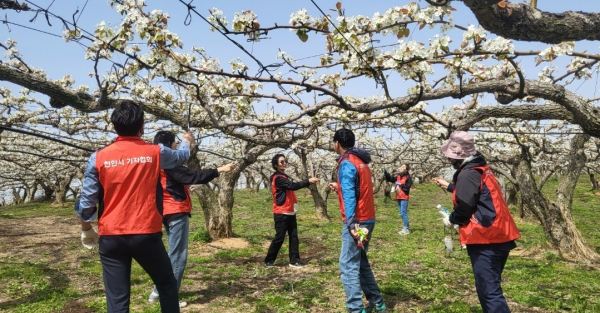 농촌 고령화 및 코로나19 장기화에 따른 외국인 근로자와 자원봉사자의 급감으로 배꽃 인공수분 작업인력이 부족해진 농가를 돕기 위해 천기협과 농어촌공사 천안지사 임직원들은 4년째 봉사를 이어오고 있다.
