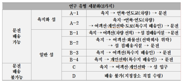 이에 한국섬진흥원은 섬 지역 택배 서비스 유형을 8가지 유형으로 세분화했다. 육지화 섬과 일반 섬으로 나눠 문전배송가능과 불가능에 대한 경우의 수를 뒀다.