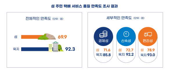 섬 주민의 택배 서비스 품질 만족도는 평균 69.9점으로, 육지 92.3점(정보통신정책연구원, 2019)과 비교해 현저히 낮은 것으로 조사됐다.