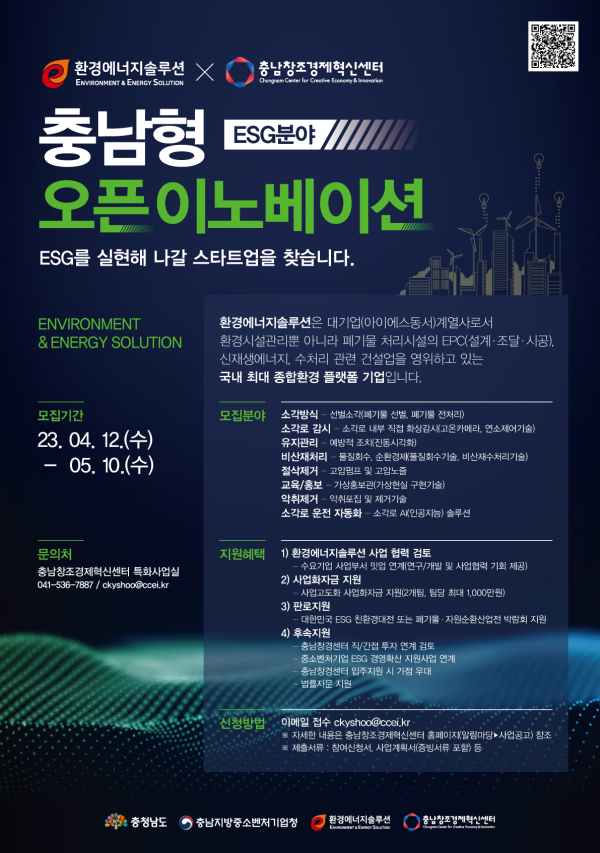 [충청뉴스 박동혁 기자] 충남창조경제혁신센터(이하 창경센터)는 환경에너지솔루션과 추진하는 충남형 오픈이노베이션에 참여할 ESG 분야 유망 스타트업을 모집한다고 12일 밝혔다.