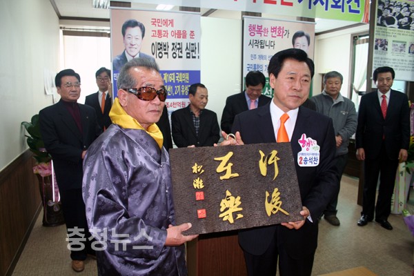 ▲ 송석찬 예비후보의 필승을 기원하는 의미가 담긴 현판을 선물로 전달했다.