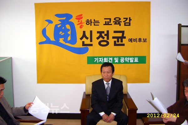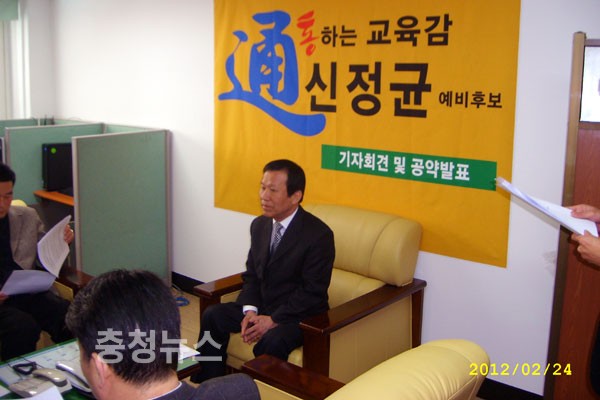 신정균 세종시 교육감 예비후보는 23일 자신의 선거사무실에서 기자회견을 열고 자신의 선거사무실에서 균형발전을 위해 소통하는 행복한 세종교육 5대 공약을 발표했다.