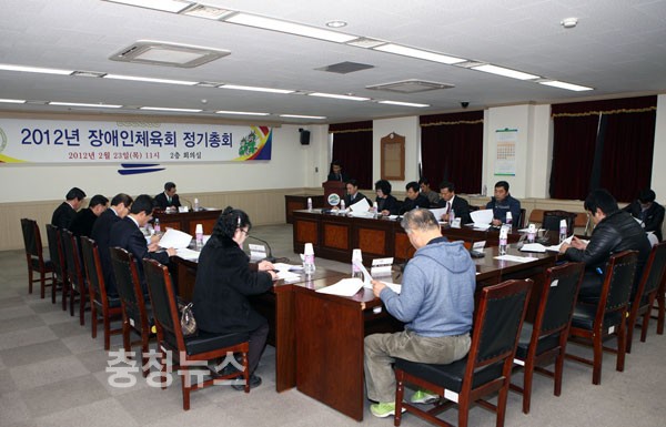 계룡시(시장 이기원)는 지난 23일 시청 상황실에서 장애인 체육회임원 및 이사 등 관계자들이 참석한 가운데 '2012년 계룡시 장애인체육회 정기총회'를 개최했다.