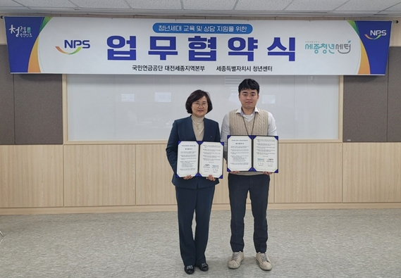 [충청뉴스 최형순 기자] 국민연금공단 대전세종지역본부(본부장 송미령)는 18일 "세종특별자치시 청년센터(센터장 홍영훈)과 청년세대 교육 및 상담 지원을 위한 업무협약을 체결했다"고 19일 밝혔다.