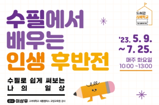 이번에 운영하는 ‘수필에서 배우는 인생 후반전’은 이상우 고려대(세종캠퍼스) 교양교육원 교수가 진행하며 수필로 쉽게 써보는 일상을 통해 자신과 세계에 대한 힐링과 치유의 과정을 제공한다.