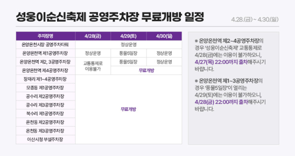 또한 온양온천역 제1~4 공영주차장의 경우 축제에 따른 교통통제와 풍물 5일장 등으로 인해 이용에 제한이 있어 주의가 필요하다.