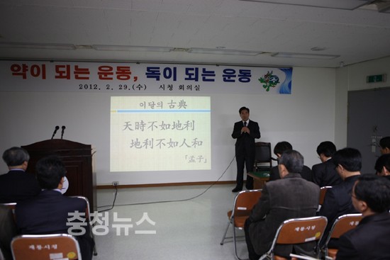 이 시장은 직원모임을 마치면서 이달의 고전으로 “맹자”의 “천시불여지리(天時不如地利) 지리불여인화”(地利不女人和) “어떤 일을 할 때 하늘의 때를 얻었을지라도 땅의 이익이 없으면 성취되지 않는다”. 또한 “땅의 이익이 있다해도 사람의 화합이 없다면 성공하지 못한다”라는 말처럼 “화합이 으뜸”임을 강조하면서 한마음으로 갈 것을 주문하였다.