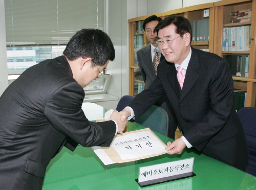 지난 4월10일 한나라당 서구청장 후보 경선에서 승리한 가기산 서구청장은 "현역의 계급장을 떼고 본격적인 선거레이스를 펼치기 위해 예비후보 등록을 하게 됐다"고 후보등록 소감을 밝혔다.