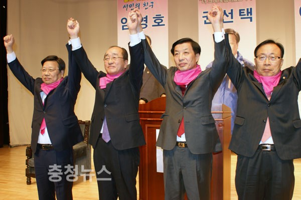 ▲ (왼쪽부터)권선택 시당위원장, 심대평 대표, 이재선 보건복지 위원장, 임영호 의원이 만세를 외치고 있다.