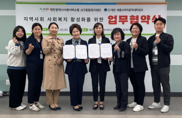[충청뉴스 최형순 기자] (사)대전세종소비자공익네트워크(회장 도정자)와 대전광역시사회서비스원 서구종합재가센터(센터장 전경애)는 26일 대전광역시사회서비스원 서구종합재가센터 2층 강당에서 업무협약식을 가졌다.