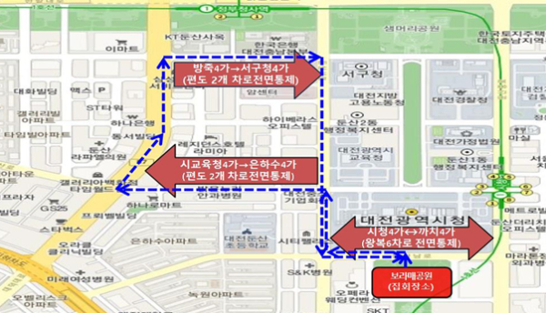 28일 대전경찰에 따르면 건설노조·택배노조 등 노조원 4천여 명이 참석하는 이번 집회는 오전 8시부터 오후 1시까지 둔산우체국과 가로수공원 소녀상 앞에서 노조별 사전집회를 시작으로 보라매공원에 모여 본 집회와 행진, 마무리집회 순으로 진행된다.