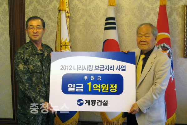 계룡건설은 육군본부에서 추진하고 있는 무주택 참전용사의 내집마련사업인 ‘나라사랑 보금자리사업’ 1차년도 후원금으로 지난해 1억원을 지원한데 이어 올해 2차년도 사업에도 1억원을 후원하기로 했다.