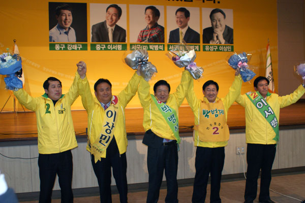 ▲ 민주통합당 대전 후보들이 19대 총선 승리를 위해 만세를 외치고 있다.