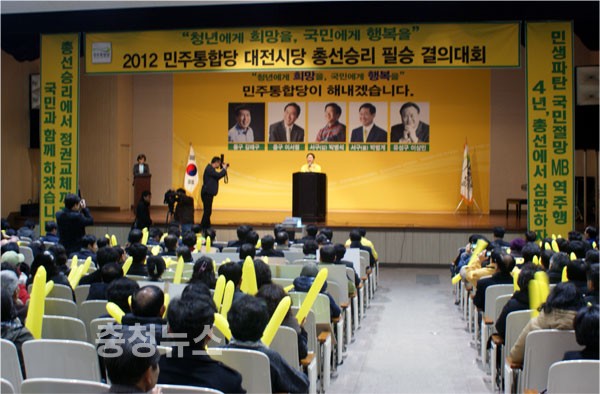 민주통합당 4,11 대전시당은  필승 결의 대회를 열고 무능한 새누리당 이명박 정권을 심판과 존재감 없는 취업 정당 선진당을 이젠 끝장을 내야한다면서 양당을 싸잡아 비판했다.