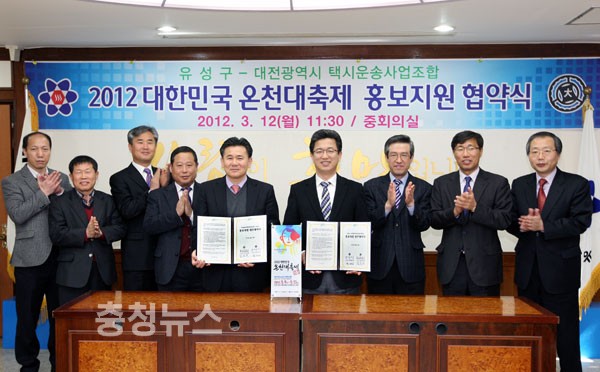 유성구(구청장 허태정)는 12일 오전 구청 중회의실에서 대한민국 온천대축제의 성공적인 개최를 위해 대전택시운송사업조합과 홍보 지원 협약을 맺었다.