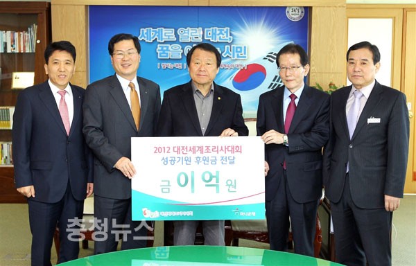 2012대전세계조리사대회 조직위원회(위원장 염홍철시장)는 (주)하나은행 충청사업본부(대표 박종덕)와 12일 오전 11시 대전시청에서 조리사대회의 성공적 개최를 위한 후원 협약을 맺고 후원금 2억 원을 조직위원장인 염홍철 시장에게 전달했다.