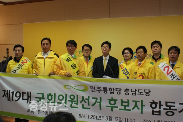 한 달 앞으로 다가온 4.11 총선에서 민주통합당으로 공천을 받은 충남지역 9명의 예비후보가 13일 MB 정권과 지역정당인 자유선진당의 심판론을 한 목소리로 제기하고 나섰다.