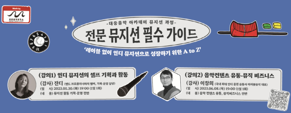 1회차인 “인디 뮤지션의 셀프 기획과 활동” 강의는 레이블 없이 뮤지션 스스로 활동을 기획하는 방법과 현장 사례를 공유한다. 밴드 ‘브로콜리너마저’의 멤버 잔디가 강사로 참여할 예정이다.