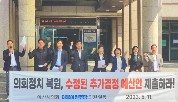 민주당 아산시의원들은 11일 아산시청사 앞에서 성명서를 통해 ”의회는 박 시장에게 충분한 시간을 주었지만, 아산시민들은 이 기간 동안 박 시장의 독선과 불통만을 확인했다“며 ”끝내 박 시장은 2023년 본예산에 담긴 교육지원 경비 예산을 모두 삭감한 예산안을 의회에 제출했다“고 말했다.