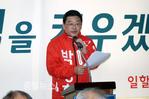 이에 앞서 축사로 나선 대덕구 재선 국회의원출신인 이인구 계룡건설 명예회장은 “박 후보는 마음을 숨기지 않는 사람이다. 꼼수가 없는 진실한 사람이다”며 극찬했다.