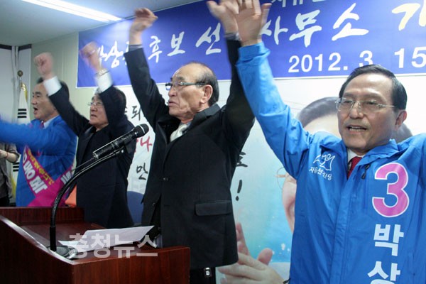 ▲ 박상돈 후보와 심대평 대표가 만세를 외치고 있다.