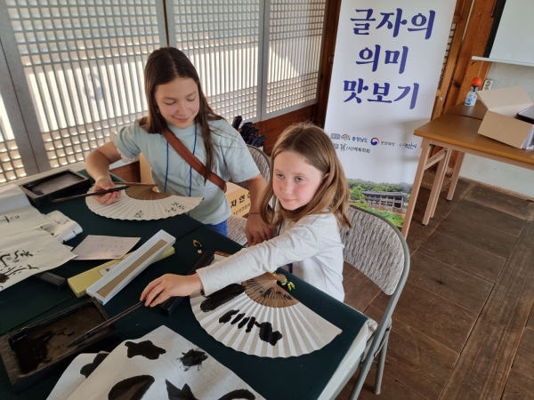 한자를 부채에 직접 그려보고 있는 주한 미군 가족 어린이들