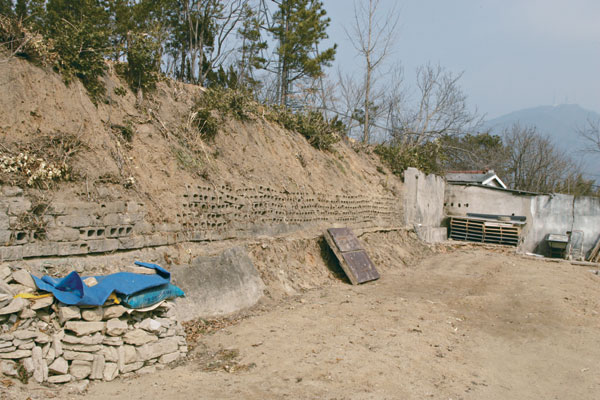 언덕을 따라 서쪽으로 이동하다가 만난 송석하(80) 할아버지도 좁은 오솔길에 앉아 함석판을 구부리고 있었다. 처마 어딘가에 매달 물받이를 만드는 모양이다. 할아버지 집은 그 언덕 경사면 아래에 있어 오솔길에서 지붕을 내려다본다. 송석하 할아버지 집 뒤 언덕 풍경이 묘하다.