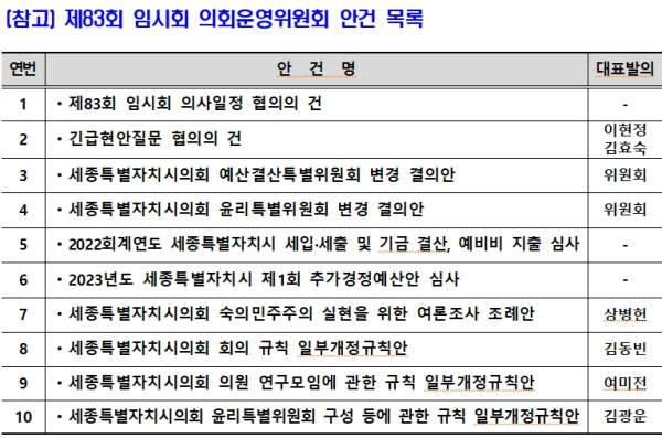 22일부터 6월 27일까지 37일간 진행되는 제83회 정례회 기간 중 저희 의회운영위원회에서는의회사무처를 대상으로 행정사무감사를 실시하고, 협의안 2건, 결의안 2건, 조례·규칙안 4건의 심사와 2022회계연도 결산안 및 2023년도 제1회 추가경정예산안을 처리할 계획이다.
