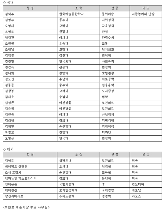 최 후보는 이어 “이 분들 역시 세종시에 대한 애정과 열정이 각별하신 분들인 만큼 세종시장에 당선된 후에도 세종시 권역별 특성화 프로젝트 및 광역경제권발전계획 수립 등 세종시 발전을 위한 정책 수립에도 이 분들의 전문성과 경험은 큰 힘이 될 것으로 믿는다”고 덧붙였다.