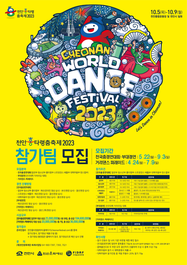 전국춤경연대회·전국대학 치어리딩 대회는 오는 9월 3일까지, 거리댄스 퍼레이드는 오는 7월 9일까지 천안흥타령춤축제 누리집을 통해 접수할 수 있다.