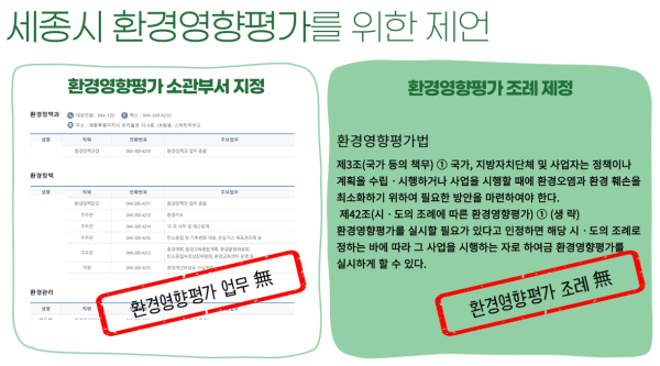 이에따라 첫째, "세종시에 환경영향평가제도를 담당할 소관 부서 지정이 필요하다. 개발사업에 따른 환경 문제에 대응하고 지속가능한 개발을 위해서는 환경영향평가가 필수적임에도 세종시는 환경영향평가를 담당하는 소관 부서도 인력도 없는 상황이고,