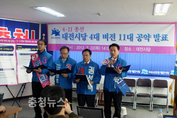 이날 공약 발표회에는 권선택 대전시당 위원장 임영호, 송종환, 송석찬, 이현 등 총선 예비 후보들이 참석한 가운데 총선 11대 공약을 발표했다.