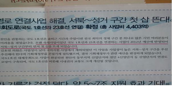 그리고 의도적 허위사실 유포가 아니라 하더라도 2011년 2월에 배정된 공사비 90억원만 인지하고 있고, 실제 집행된 공사비가 50억원인 줄도 모르고 있다가 1년여의 시간이 흐른 시점에 작성한 의정보고서에 실제 공사비 90억원이라고 명시한 그 자체가 김호연 후보가 북천안IC 공사에 대해, 얼마나 무관심했는지를 잘 보여주는 하나의 단면이라고 주장했다.