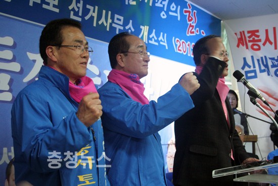 ▲ 심대평 후보,유한식 세종시장 후보 이명수 후보가 파이팅을 하고 있다