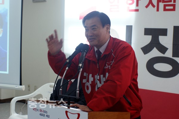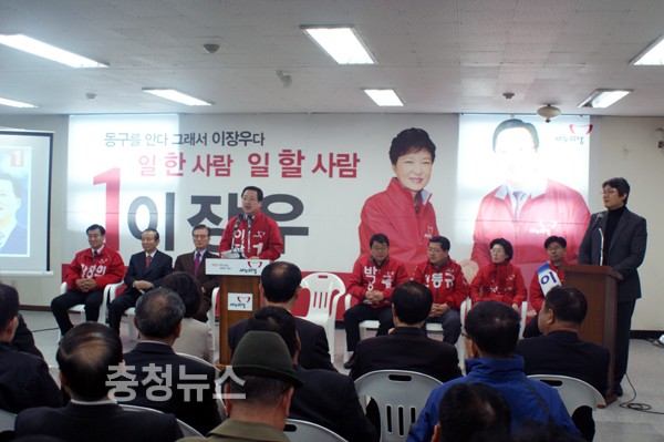축사로 나선 강창희 시당위원장은 “충청도의 정치 1번지인 동구가 왜 5번지가 된 이유가 무엇이냐. 그건 똑바른 사람 뽑지 않아서 그런 것”이라며 “이장우처럼 작지만 탕탕하고 빳빳하고 패기가 충만한 이런 국회의원 뽑았더라면 동구는 아마 지금 여전히 충청도의 정치 일번지로 남았을 것”이라고 치켜세웠다.