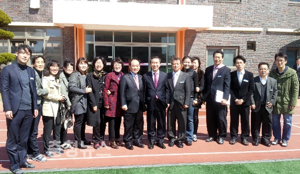 ▲ 김종성 교육감이 논산동성초등학교를 방문해 관계자들과 기념촬영을 하고 있다.