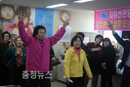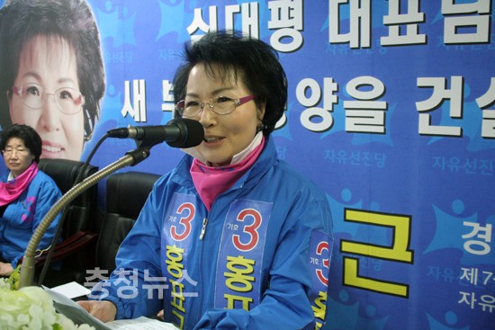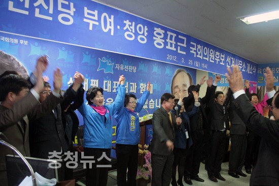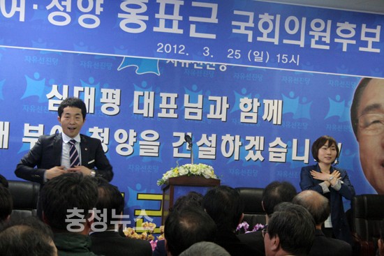 이에 앞서 심대평 대표는\격려사에서 "홍 후보는 부여,청양로 부터 나라를 구하는 충청을 구하는 선봉에 서고자 나왔다. 자유선진당의 유일한 지역구 출마한 여성후보이고  부여,청양을 새롭게 바꾸고 대한민국을 지켜내는 중심에 설수 있도록 홍표근 후보를 꼭 국회로 보내달라고 지지를 당부했다.