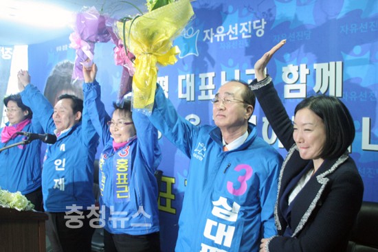 ▲ 우-문정림 대편인,심대평 대표와 홍표근 후보, 이인제 선대위원장, 황인자 최고위원이 만세를 하고 있다