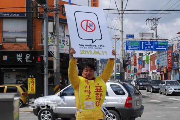 민주통합당 서산·태안 조한기 후보는 지난 24일 서산시 동문동 삼일상가사거리 앞에서 투표참여를 호소하는 1인 캠페인을 벌였다.
